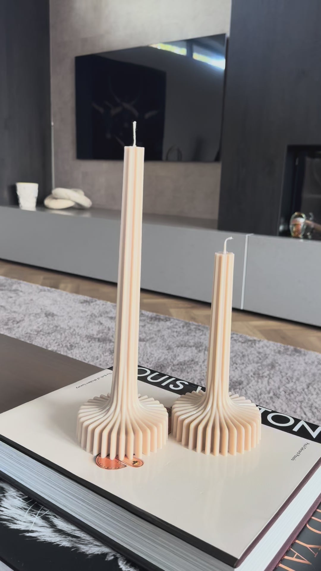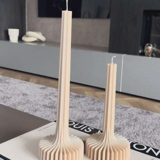 Set of 2 beautiful hand poured ribbed candles. A beautiful elegant candle due to its ribbing. This set of 2 contains a beige colored candle. The candle is vegan, environmentally friendly, biodegradable and sustainable. Each candle is hand poured with care. The candles may have minor imperfections. That makes the candle unique. Even if the candles are not burned, they are decorative in any interior.